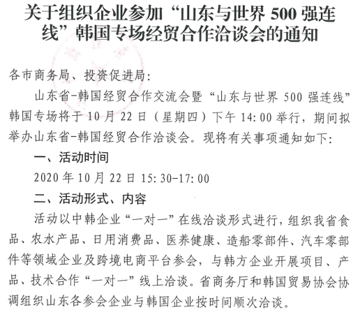 Our Company will Participate in the "CONNECTING SHANDONG WITH FORTUNE GLOBAL 500" South Korea Special Economic and Trade Cooperation Meeting